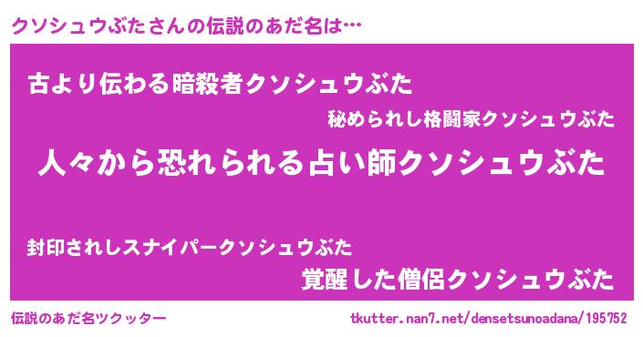 | 意味不明あだ名 | 『自称クソシュウぶた』 |