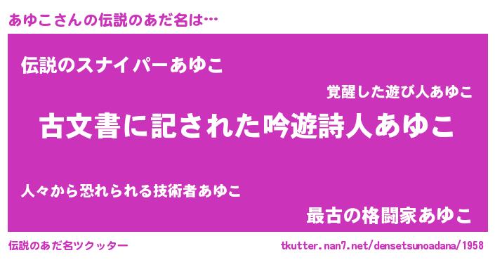 | 意味不明あだ名 | 『永久保存あゆこ』『ペロリンあゆこ』 |