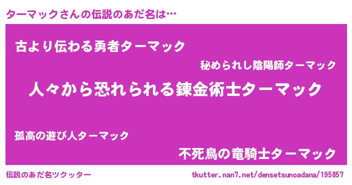 | 男性向けラノベタイトル風あだ名 | 『おまえをオタクにしてやるから、俺をターマックにしてくれ! 』 |