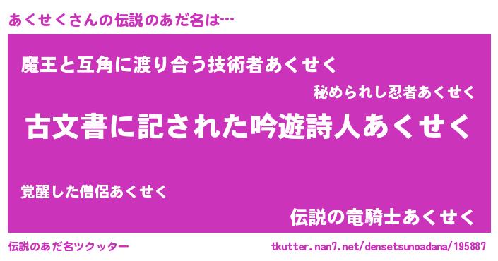 | 意味不明あだ名 | 『永久保存あくせく』『自称あくせく』 |