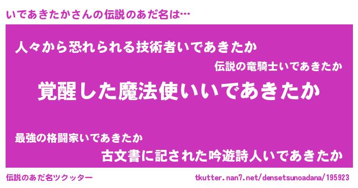 | 肩書あだ名 | 『いであきたか団長』『いであきたか閣下』 |