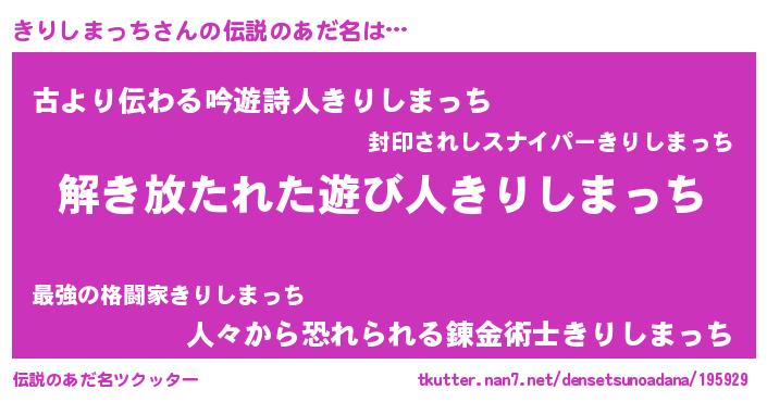 | ヒーロー風カッコイイあだ名 | 『銀牙騎士キリ』『ネオキリシマッチ』 |