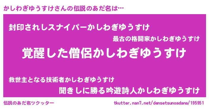 | 男性向けラノベタイトル風あだ名 | 『かしわぎゆうすけの嫁は女の子じゃないと思った?』 |
