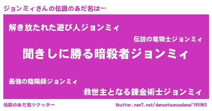 | 意味不明あだ名 | 『永久保存ジョンミィ』『自称ジョンミィ』 |