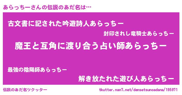 | ヒーロー風カッコイイあだ名 | 『愛の使者あらっちー』『ネオアラッチー』 |