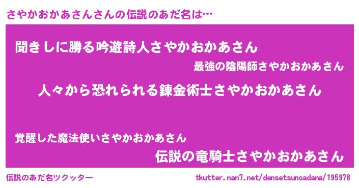 | 男性向けラノベタイトル風あだ名 | 『サヤカオカアサンスレイヤー』 |