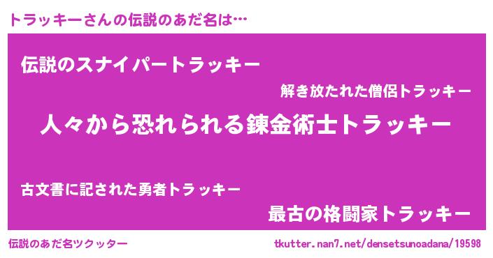 | 男性向けラノベタイトル風あだ名 | 『おまえをオタクにしてやるから、俺をトラッキーにしてくれ! 』 |