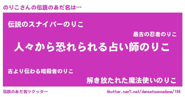 | 女子向けラノベタイトル風あだ名 | 『のりこ夫妻のなれそめ』『闇ののりこ』 |