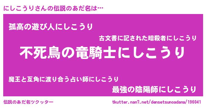 | ヒーロー風カッコイイあだ名 | 『スーパーニシコウリ』『暗黒騎士ニシ』 |