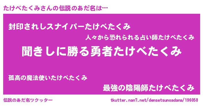 | ヘコむあだ名 | 『たけべたくみ(震え声)』『たけふぇ~』 |