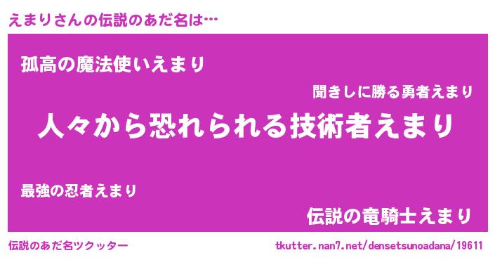 | 女子向けラノベタイトル風あだ名 | 『えまり夫妻のなれそめ』『闇のえまり』 |