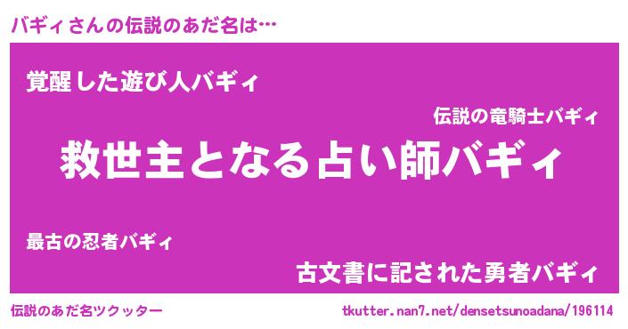 | ヒーロー風カッコイイあだ名 | 『慈愛の使者バギィ』『炎刃騎士バギ』 |