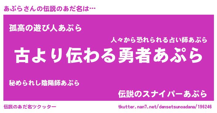 | 意味不明あだ名 | 『永久保存あぷら』『自称あぷら』 |