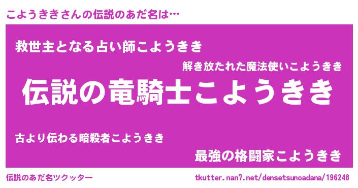 | ヒーロー風カッコイイあだ名 | 『スーパーコヨウキキ』『黄金騎士コヨ』 |