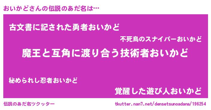 | 男性向けラノベタイトル風あだ名 | 『おまえをオタクにしてやるから、俺をおいかどにしてくれ! 』 |