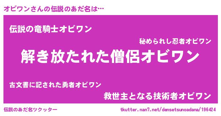 | 女子向けラノベタイトル風あだ名 | 『乙女ゲームの破滅フラグしかない悪役オビワンに転生してしまった…』 |