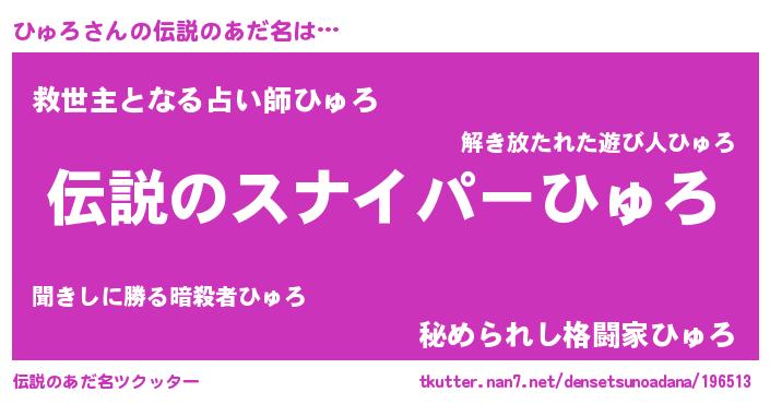 | 男性向けラノベタイトル風あだ名 | 『魔弾の王とひゅろ』『ヒュロスレイヤー』 |