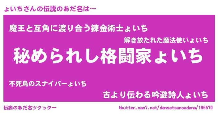 | 意味不明あだ名 | 『ょいちフォーエバー』『自称ょいち』 |