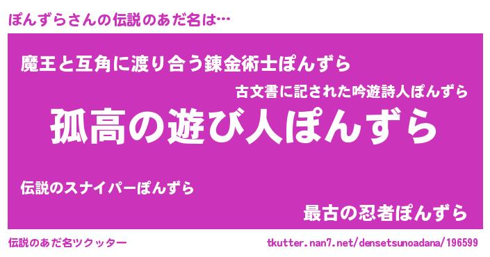 | 男性向けラノベタイトル風あだ名 | 『魔弾の王とぽんずら』 |