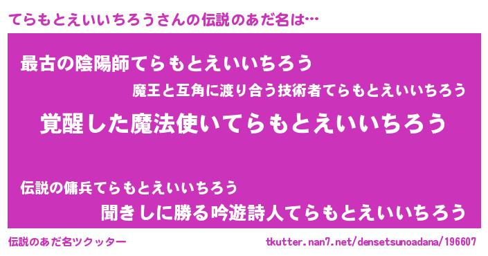 | 男性向けラノベタイトル風あだ名 | 『てらもとえいいちろうに滅ぼされるだけの簡単なお仕事です』 |