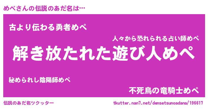 女子向けラノベタイトル風あだ名 | 『めぺの卵を拾いまして』 |
