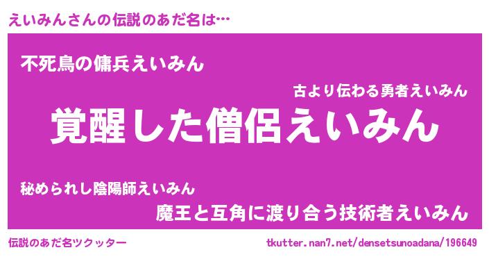 | ヒーロー風カッコイイあだ名 | 『天弓騎士エイ』『スーパーエイミン』 |