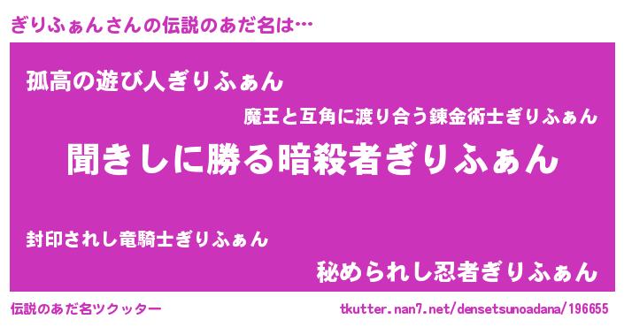 | 男性向けラノベタイトル風あだ名 | 『ギリファンスレイヤー』 |