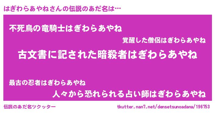 | ヒーロー風カッコイイあだ名 | 『ネオハギワラアヤネ』『仮面ハギダー』 |