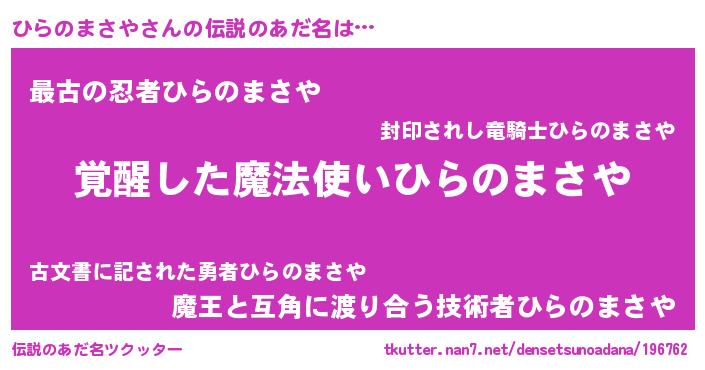 | ポケモン風あだ名 | 『ヒラゴンZ』『ヒヒラノマサヤ』 |