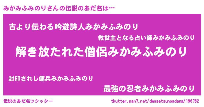 | 男性向けラノベタイトル風あだ名 | 『みかみふみのりの嫁は女の子じゃないと思った?』 |