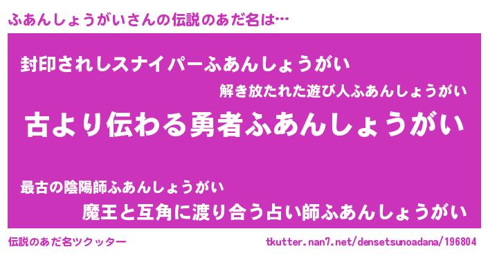| ヘコむあだ名 | 『ふあんしょうがい(遠い目)』『ふあ太郎』 |