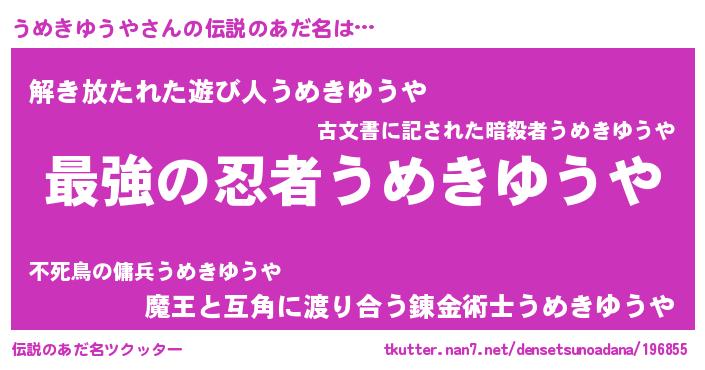| 男性向けラノベタイトル風あだ名 | 『うめきゆうや~年齢イコール彼女いない歴の魔法使い~』 |
