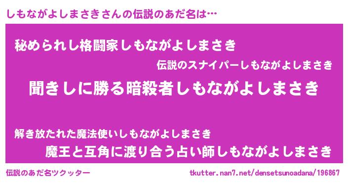 | 胡散臭い通販商品みたいなあだ名 | 『絶対に幸福をもたらす健康食品…その名も「しもながよしまさき」』 |