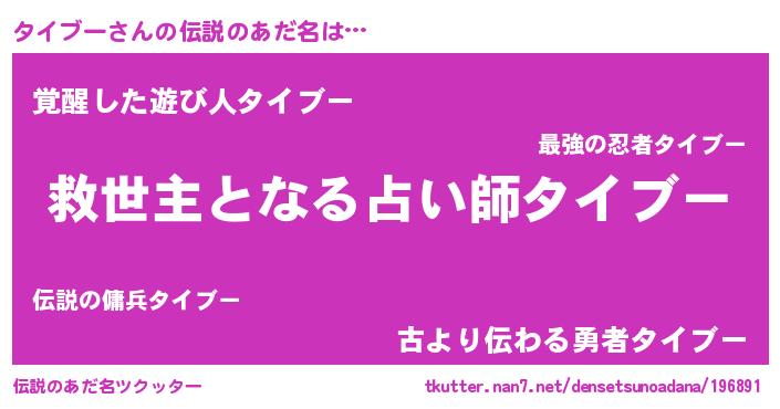 | ヒーロー風カッコイイあだ名 | 『慈愛の使者タイブー』『天弓騎士タイ』 |