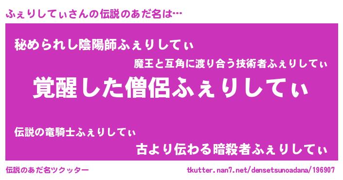 | 男性向けラノベタイトル風あだ名 | 『ふぇりしてぃの嫁は女の子じゃないと思った?』 |