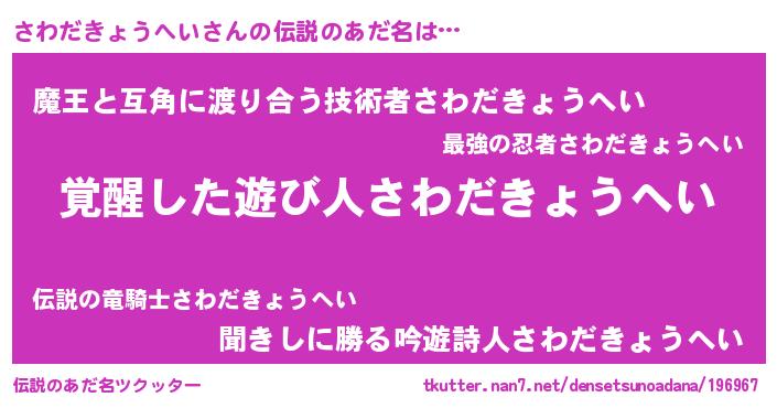 | 男性向けラノベタイトル風あだ名 | 『さわだきょうへい~年齢イコール彼女いない歴の魔法使い~』 |