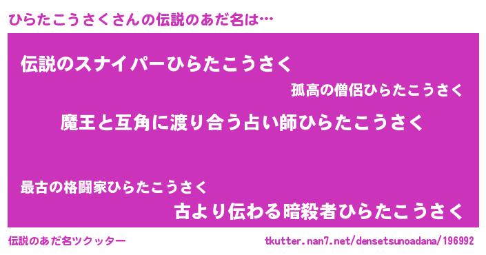 | ヘコむあだ名 | 『ひらにゅー』『ひらたこうさく(遠い目)』 |