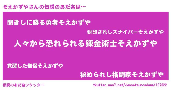 | 意味不明あだ名 | 『住所不定無職そえかずや(98歳)』 |