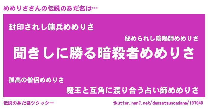 | ヒーロー風カッコイイあだ名 | 『ネオメメリサ』『スーパーメメリサ』 |