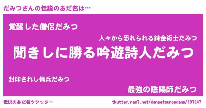 男性向けラノベタイトル風あだ名 | 『魔法科高校のだみつ』 |