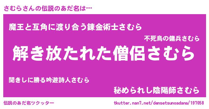 | 意味不明あだ名 | 『とにかく怪しいさむら』『自称さむら』 |