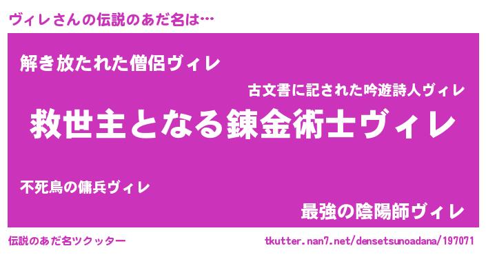 | ヒーロー風カッコイイあだ名 | 『最強戦士ヴィレ』『愛の使者ヴィレ』 |