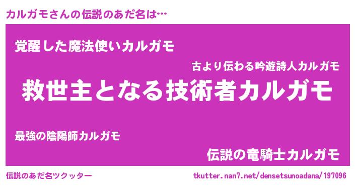 | 男性向けラノベタイトル風あだ名 | 『ノーゲーム・ノーカルガモ』 |