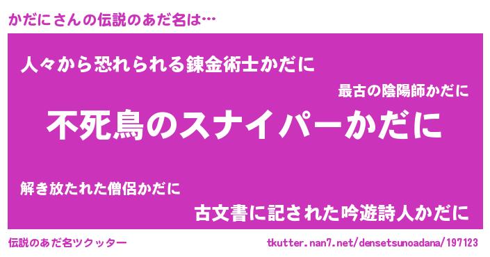 | 男性向けラノベタイトル風あだ名 | 『かだにの憂鬱』『緋弾のカダニ』 |