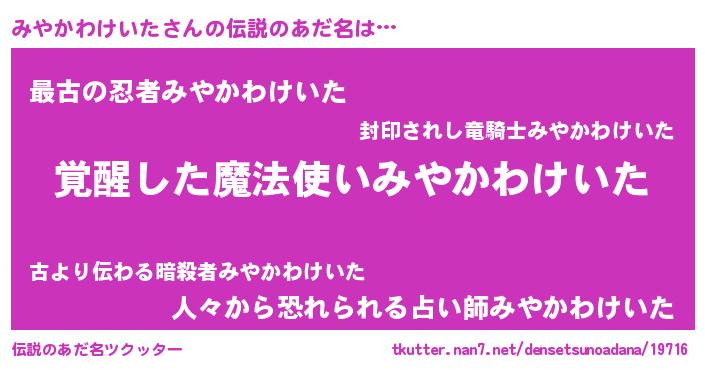| 男性向けラノベタイトル風あだ名 | 『みやかわけいたの嫁は女の子じゃないと思った?』 |