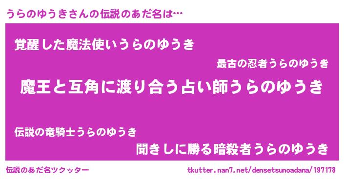 | 女子向けラノベタイトル風あだ名 | 『乙女ゲームの破滅フラグしかない悪役うらのゆうきに転生してしまった…』 |