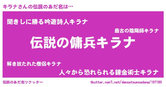 | 男性向けラノベタイトル風あだ名 | 『キラナの憂鬱』『キラナスレイヤー』 |