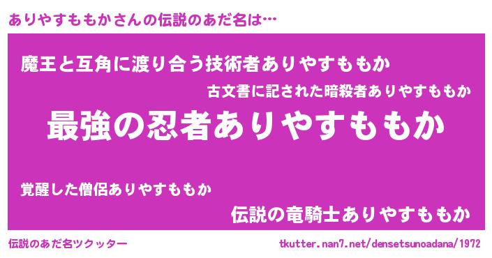 | 男性向けラノベタイトル風あだ名 | 『ありやすももか~年齢イコール彼女いない歴の魔法使い~』 |