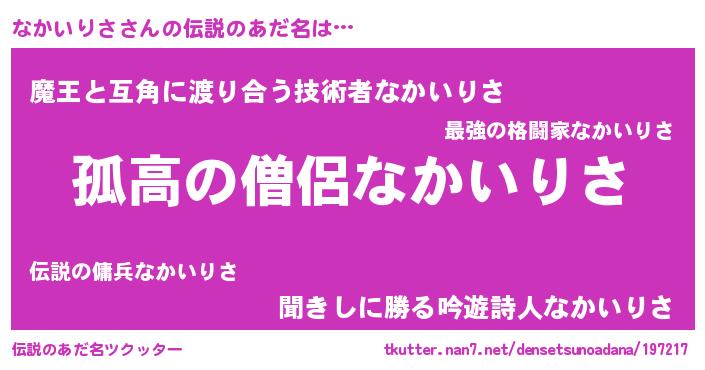 | ヒーロー風カッコイイあだ名 | 『黄金騎士ナカ』『慈愛の使者なかいりさ』 |