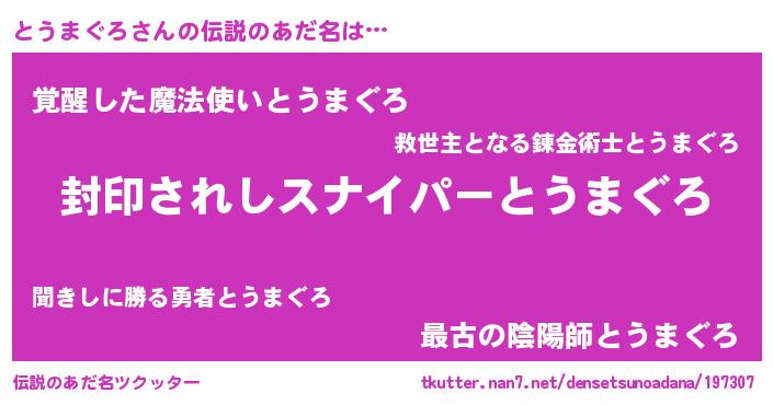 | 男性向けラノベタイトル風あだ名 | 『トウマグロアートオンライン』 |